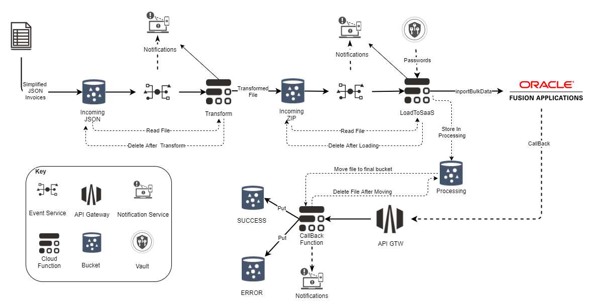 The above diagram shows a pattern of loading data into Fusion SaaS ERP using serverless technologies.