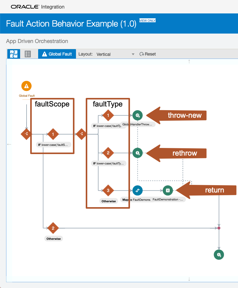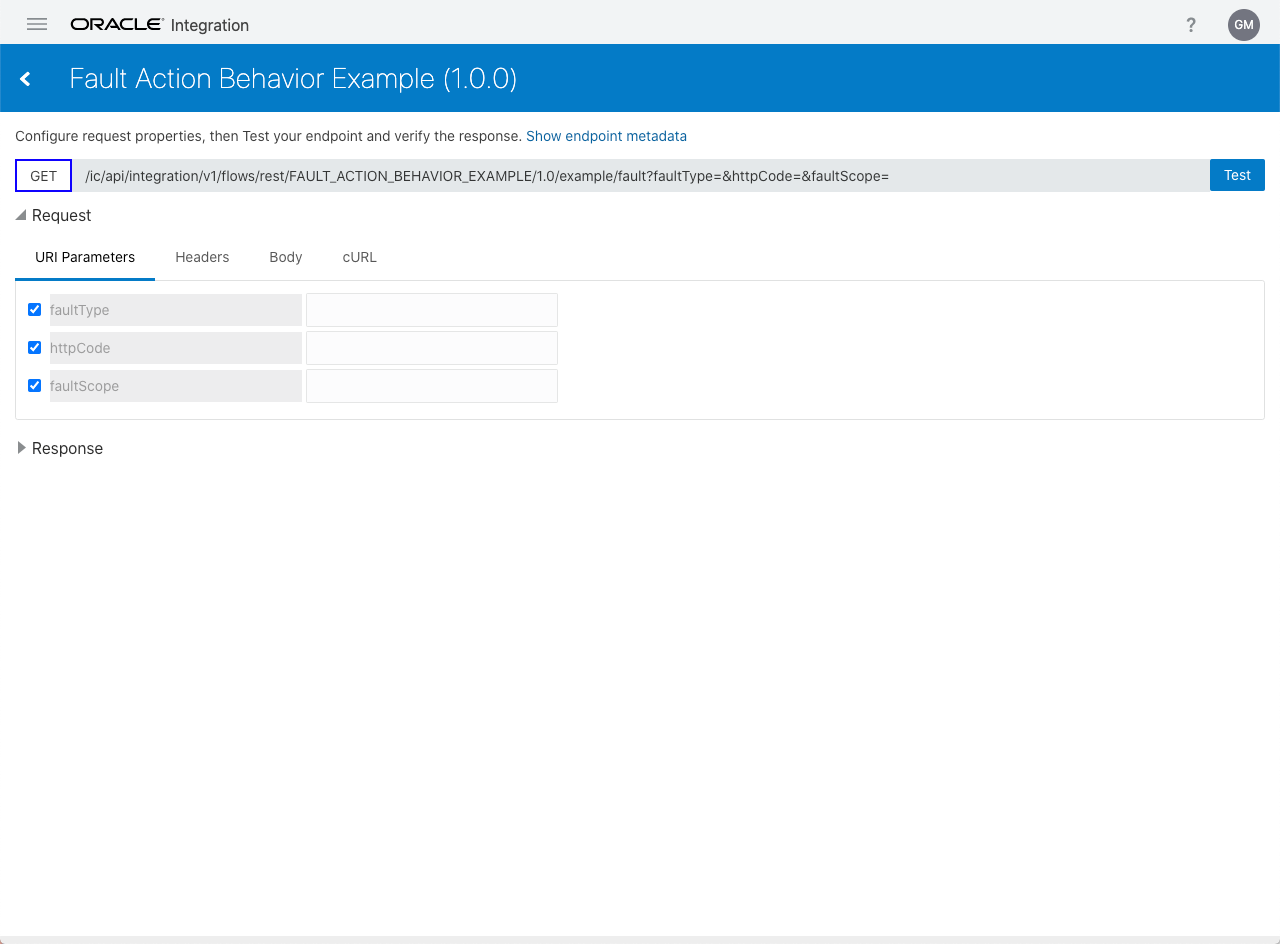 On the topic of fault handling in Integration Cloud (IC), there are three types of Fault Actions that can be leveraged: 1. Re-throw Fault, 2. Throw New Fault, and 3. Fault Return.  More times than not, a discussion comes up around why faults thrown in IC are always HTTP 500.  This is not necessarily true and this blog will clarify the behaviors of each of the Fault Actions.  To illustrate the Fault behaviors, a simple integration will be used where URI Parameters control the various scenarios.