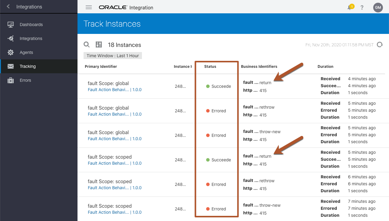 Notice that the instance Status for the Return Fault Action results in Succeeded vs. Errored.  What this means is the error in the integration has been caught and handled successfully resulting in a status being returned to the caller.  On the flip side, when the integration throws a fault it means that the integration instance did not successfully handle the fault and is throwing it to the caller to take care of it.
