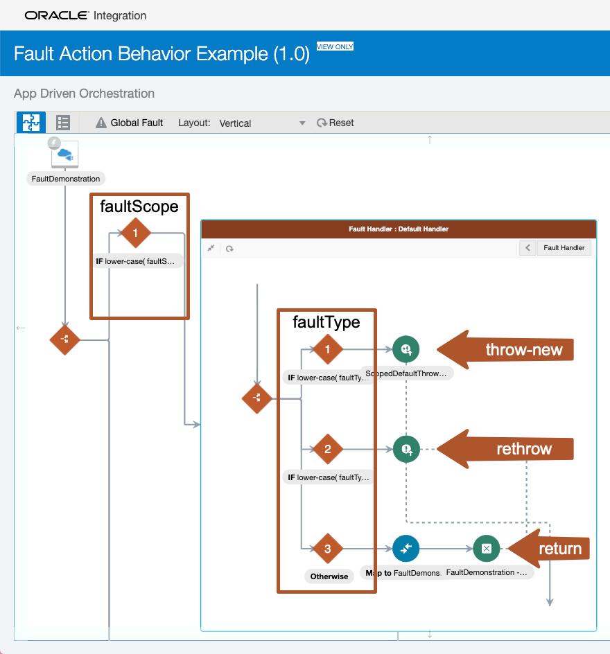 Once we are in either the Default Handler for the scope or the Global Default Handler, the faultType parameter is used to control what Fault Action will come into play: