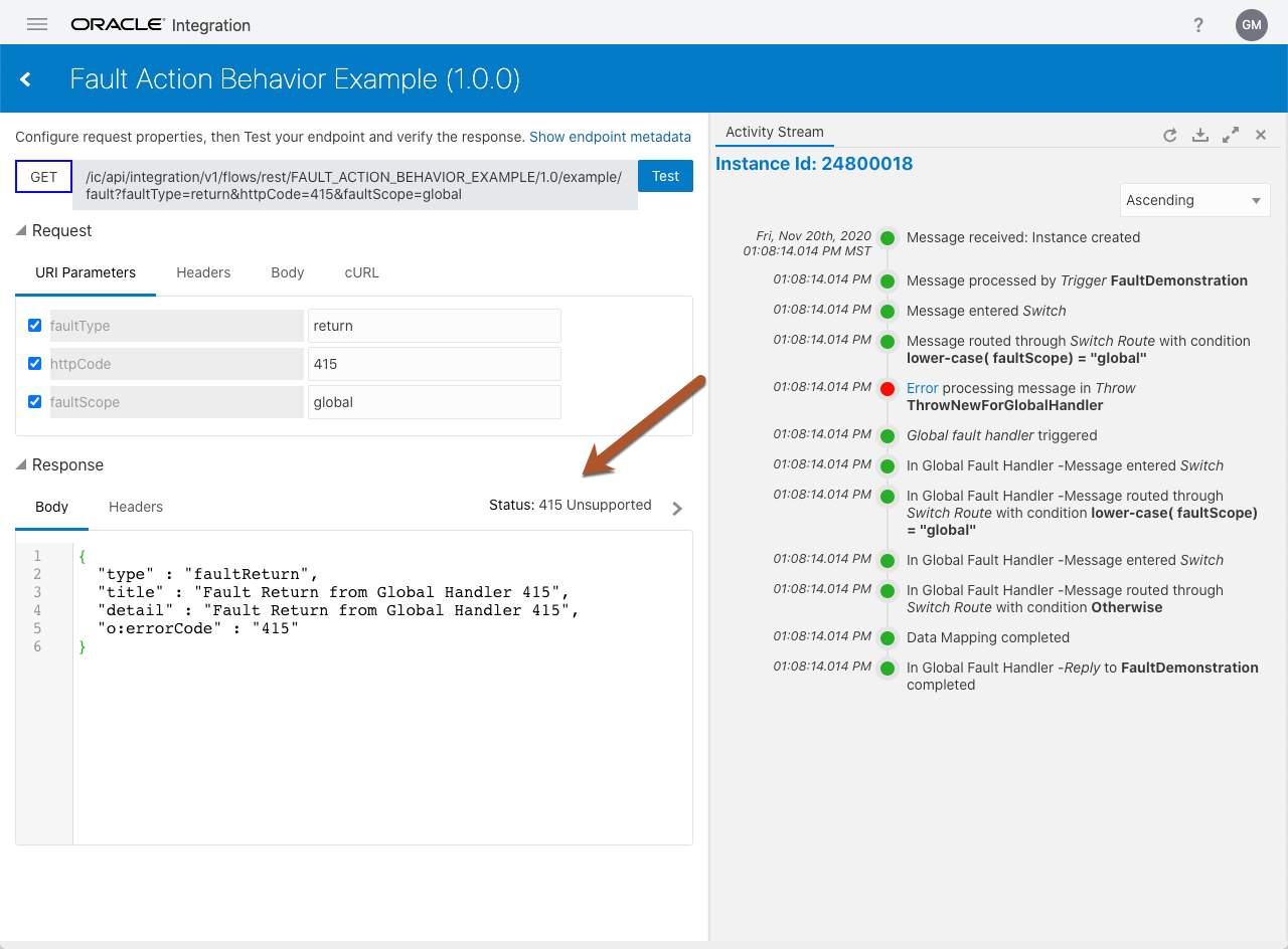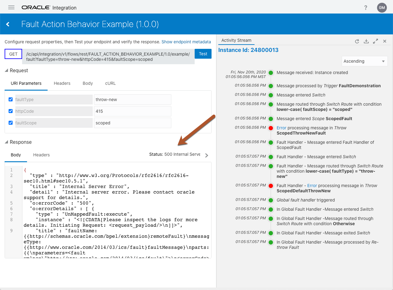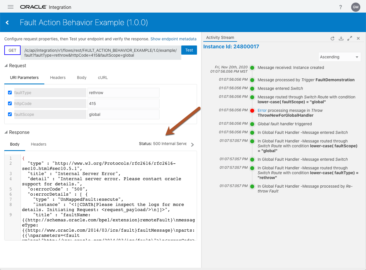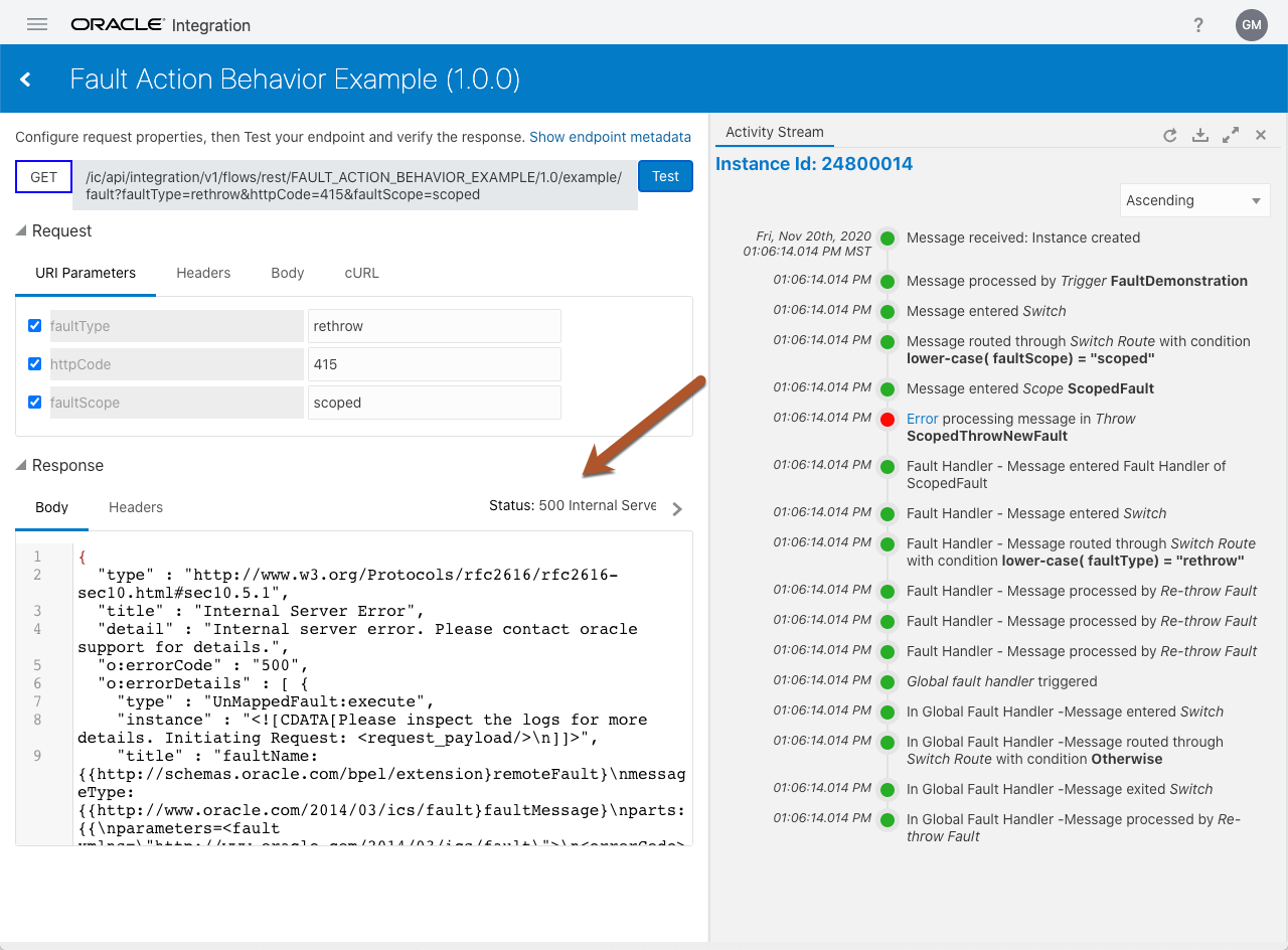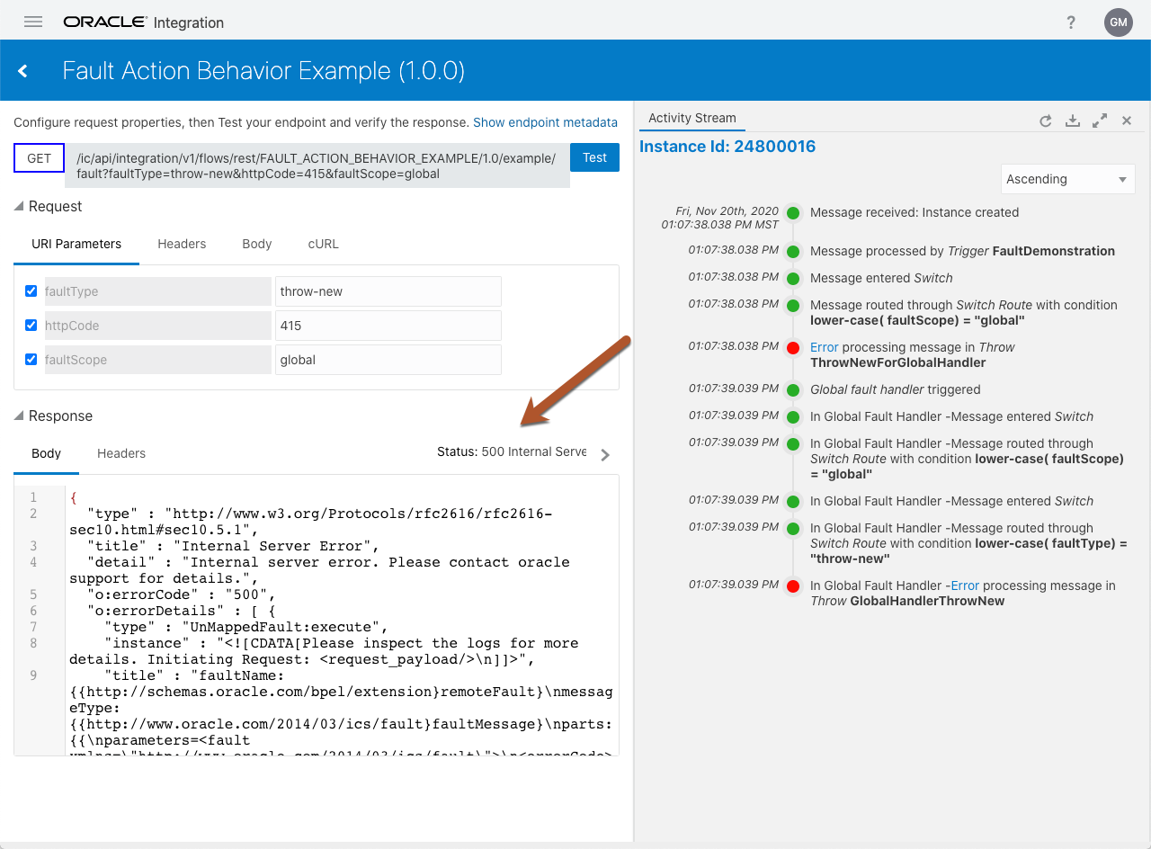 We can see that whenever a fault is “thrown” (throw-new or rethrow), IC will surface the fault as a 500 Internal Server Error with the real fault in the “o:errorDetails”. The biggest complaint with this behavior is the actual errorCode is buried in the “o:errorDetails”.  Adding to the challenge, what if the business use case requires that the actual HTTP status code be surfaced vs. a generic 500 status code?  Based on our test cases, we have an option with the Return Fault Action as the correct HTTP status code is returned along with the fault details.  However, this has a not so obvious impact on the integration instance Status: