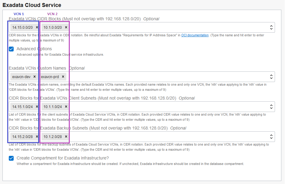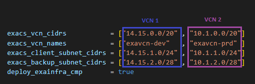 • exacs_vcn_cidrs: list of CIDRs to be used when creating the VCNs. Each CIDR indicates the creation of one VCN. Make sure they do not overlap with 192.168.128.0/20.