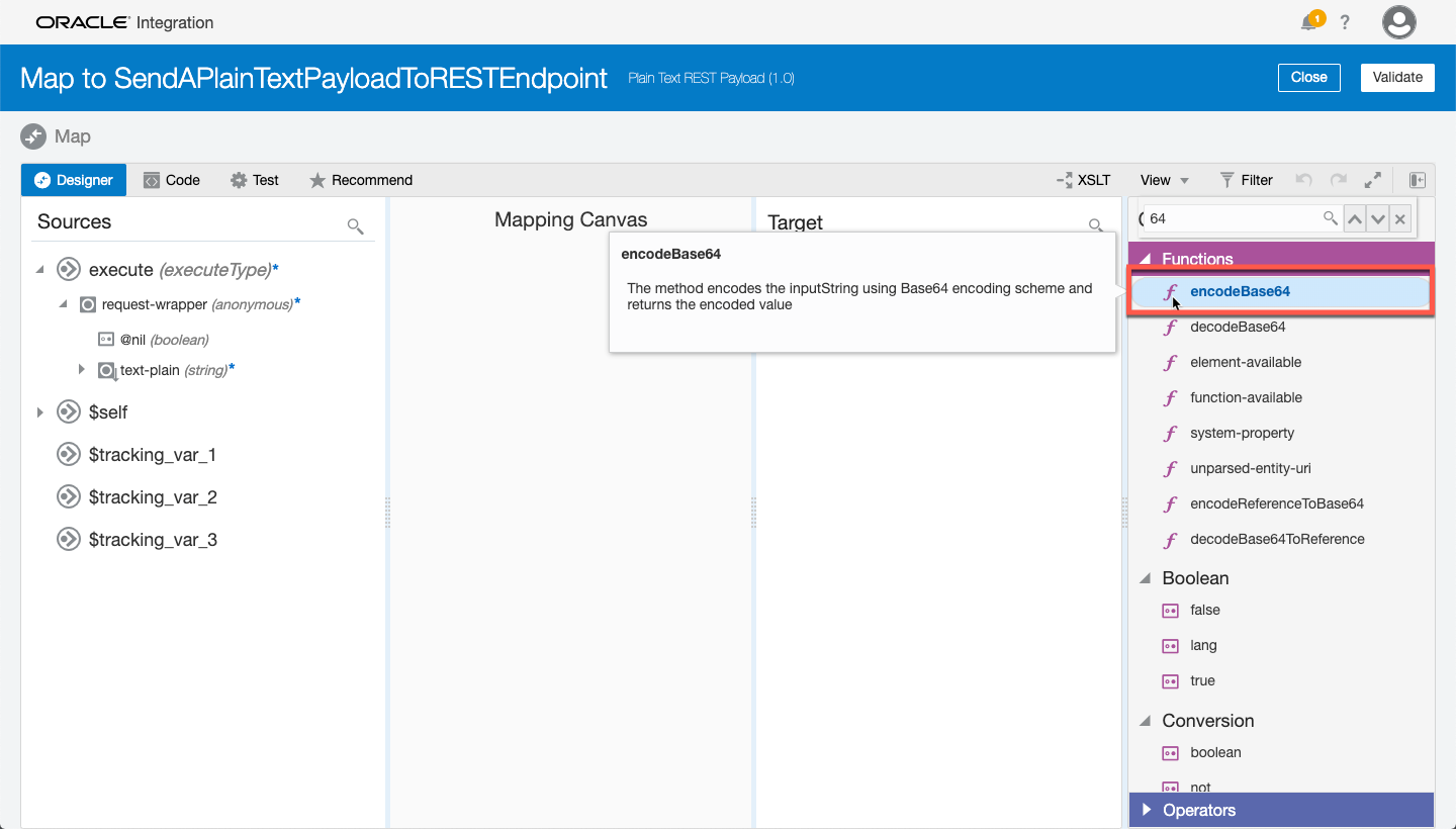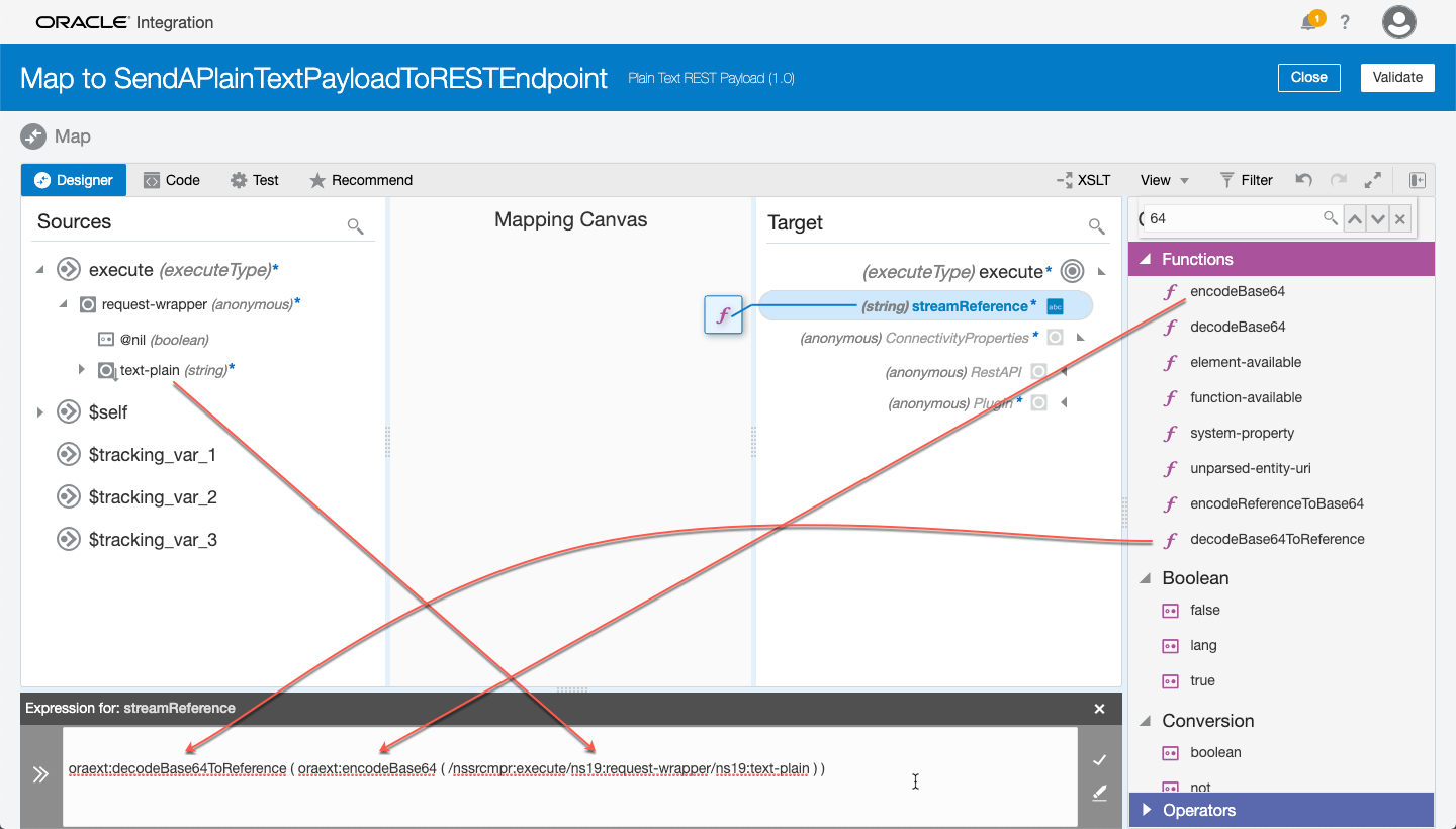Notice that the plain text string is first being encoded to Base64 and then decoded from Base64 to a reference.  Once this mapping is setup/configured, you can Test the mapping in OIC to see what the results will look like: