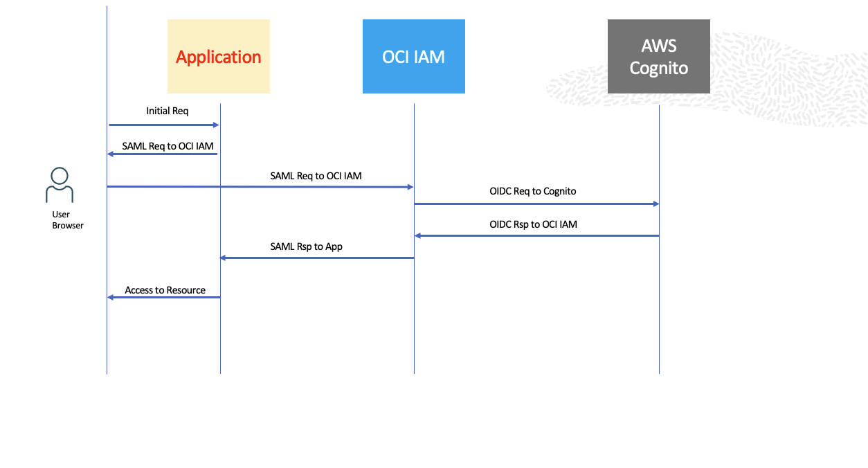 As an example, let us consider AWS Cognito as the IDP from where we would like to migrate users along with their passwords into OCI IAM. A typical federation flow would look like the following: