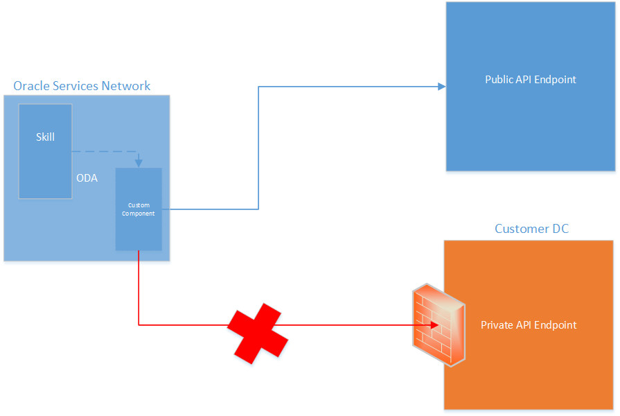 There can be many more such scenarios where a chatbot needs to integrate in a hybrid environment. ODA provides Custom Components for users to connect their ODA skills to external endpoints. However, ODA requires that such endpoints are publicly available for ODA to connect.