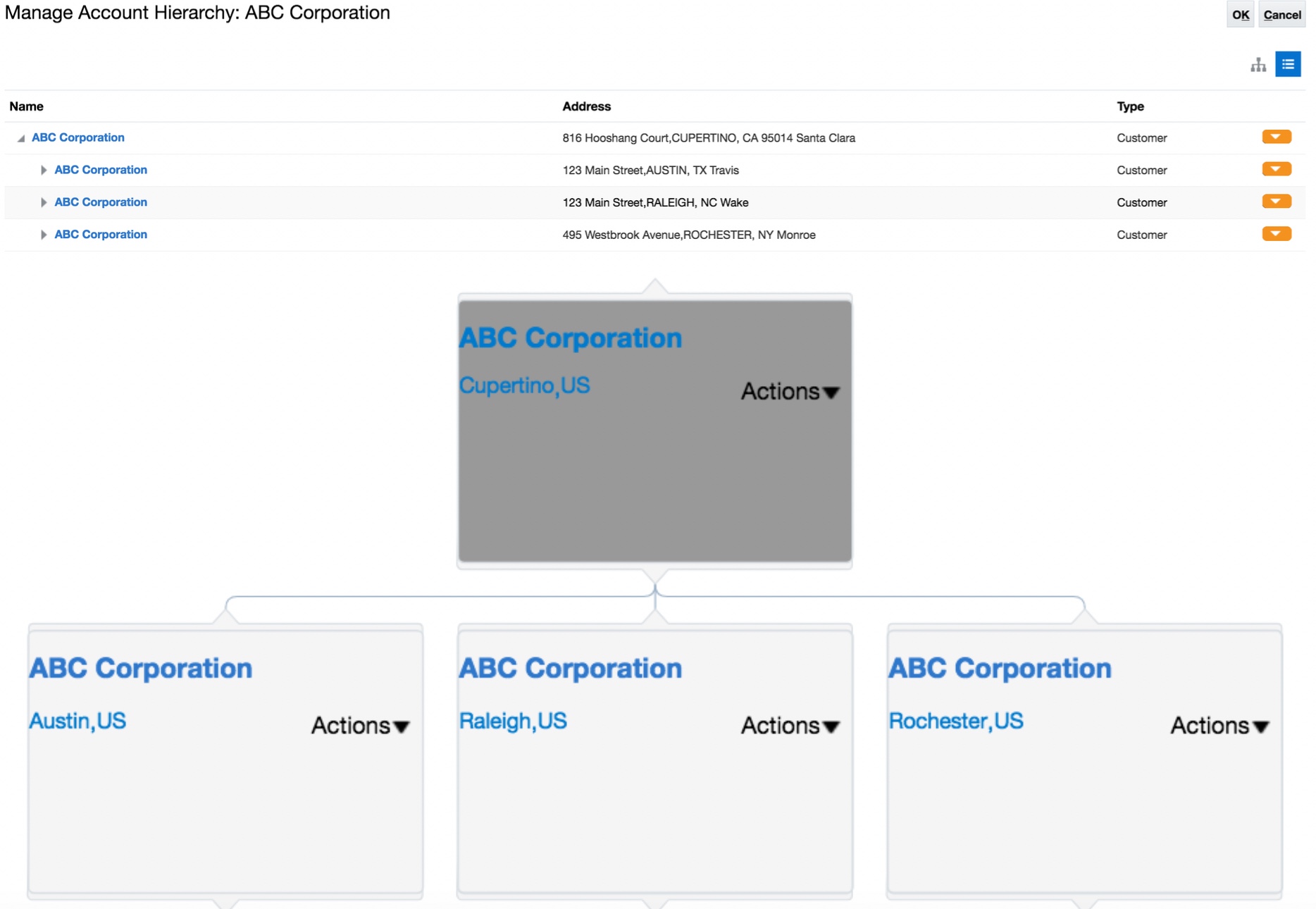 Oracle Engagement Cloud has both a graphical chart view and a table view for account hierarchies