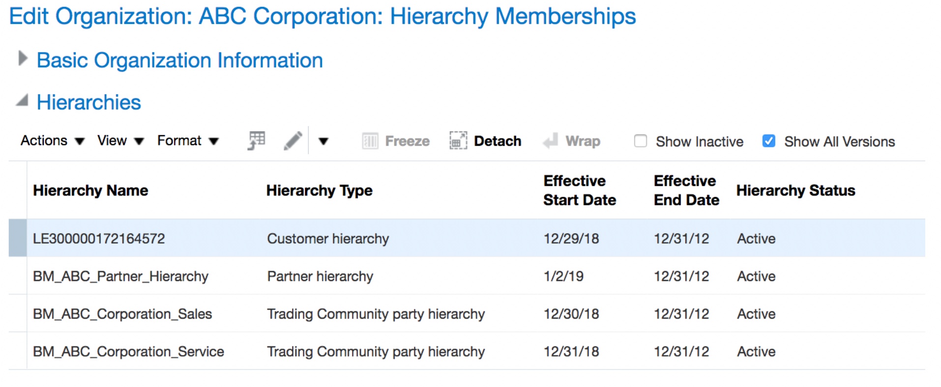 You can create multiple versions of a customer hierarchy; however, only one hierarchy version can be active on a specific date. You can create a new hierarchy to represent the structure of a new customer. If the customer has made minor changes to its organization, you can create a new version rather than edit the existing one.