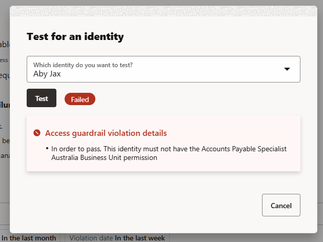 After defining the Access Guardrail, Access Governance also allows the Administrator to check it against an identity for validation and accuracy.