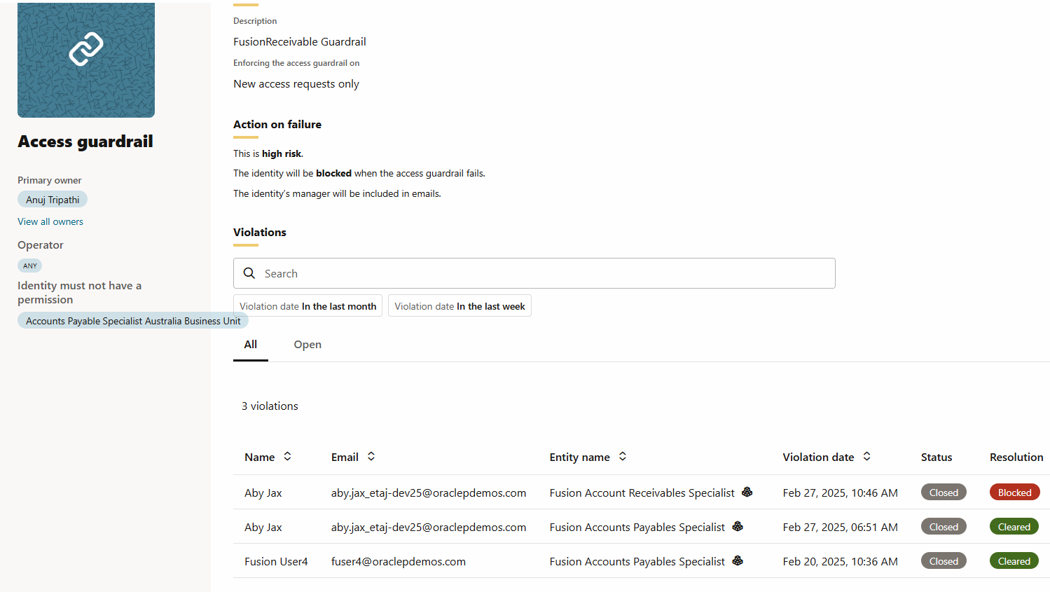 The Access Governance Administrator can also view all the violations for each AccessGuardrails.