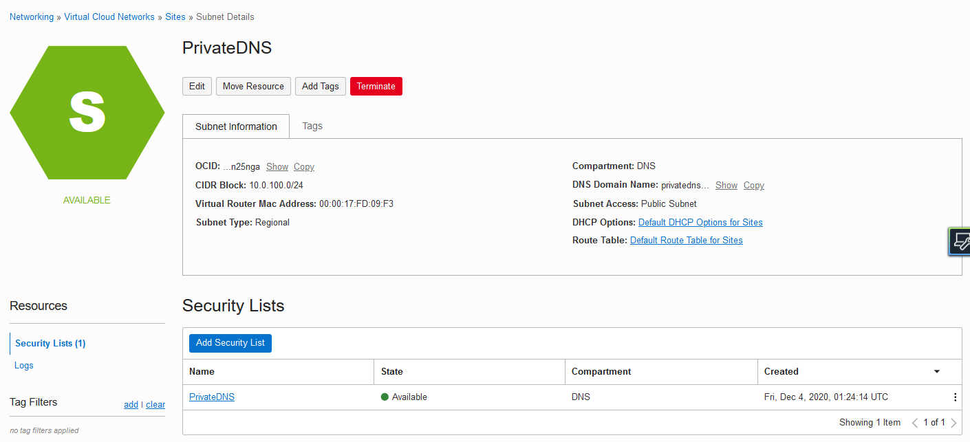 Next, assign this security list to the new subnet, which in this example is also named PrivateDNS. The subnet prefix is 10.0.100.0/24.
