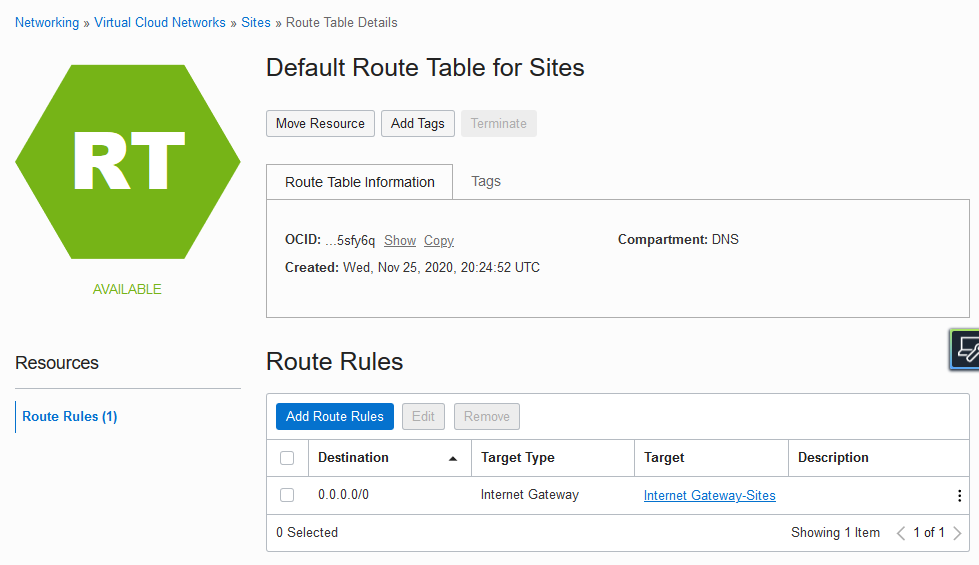 In this example, the VCN that hosts the castro.cloud webserver is named Sites. To see the details of this VCN, click the Sites link under Instance Details.