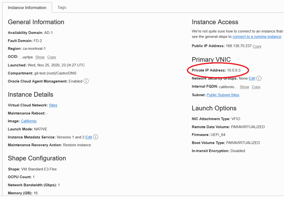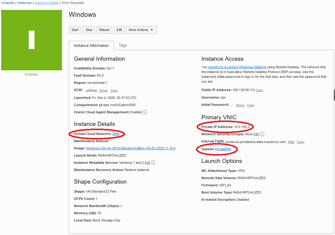 Create a Windows instance in the subnet that you created. The following image shows the details of the instance created for this example. It was created in the PrivateDNS subnet of the Sites VCN, and its private IP address is 10.0.100.2.