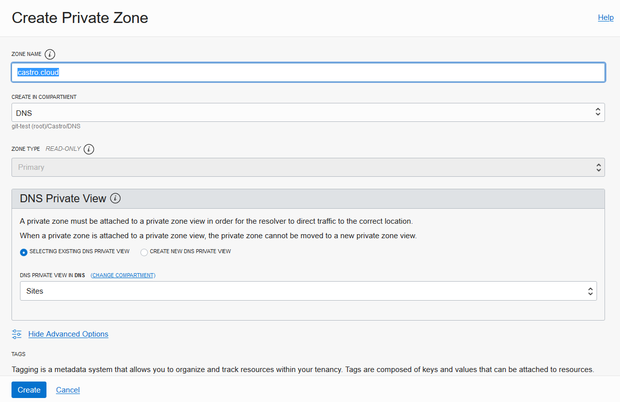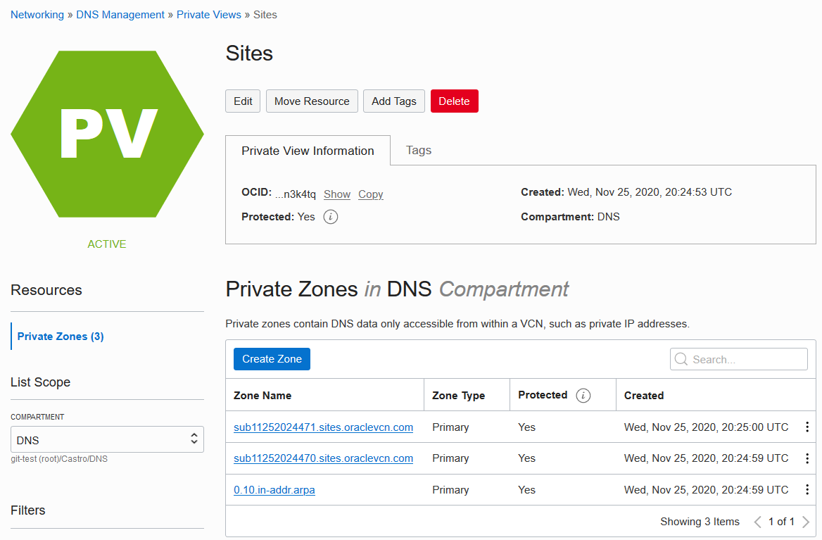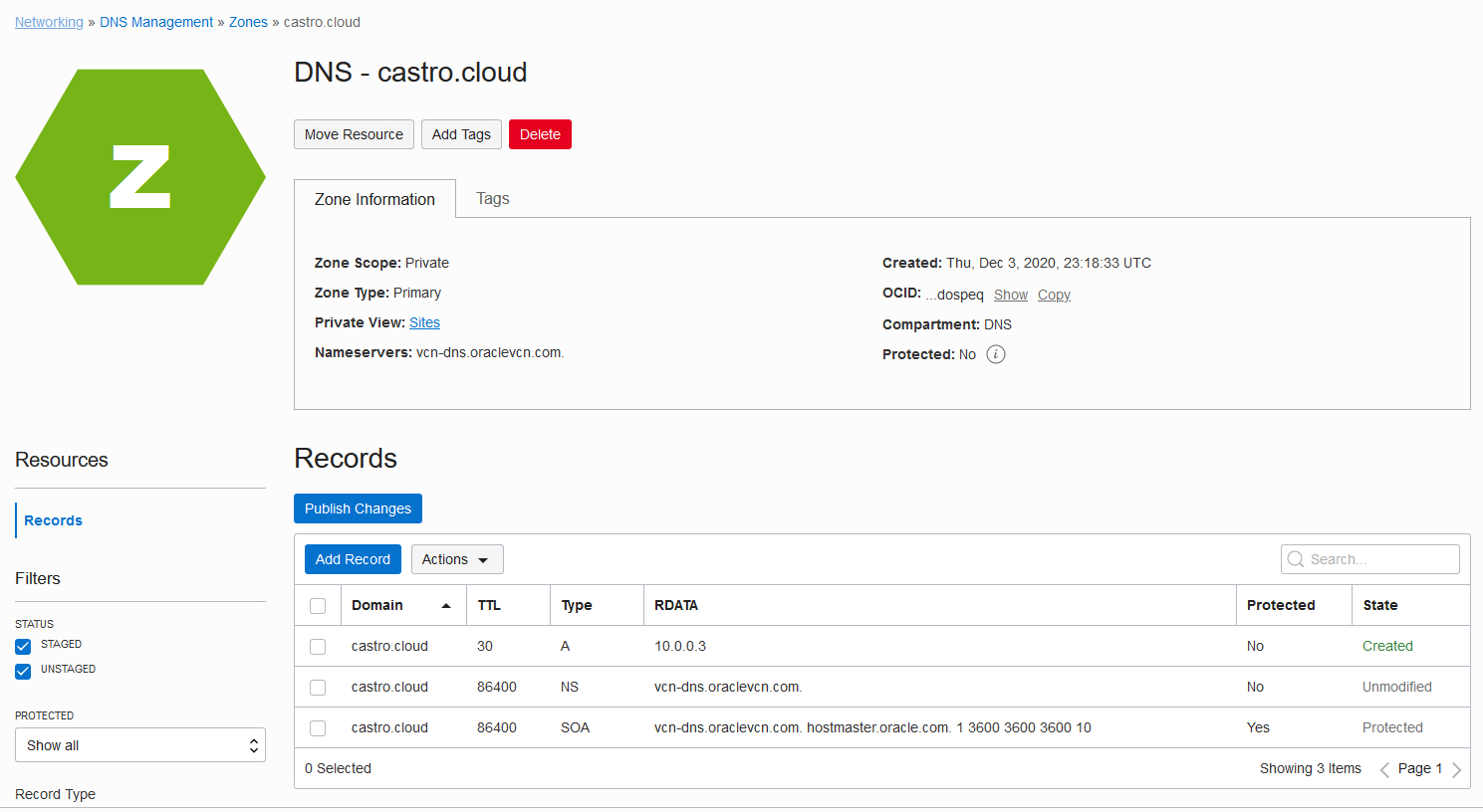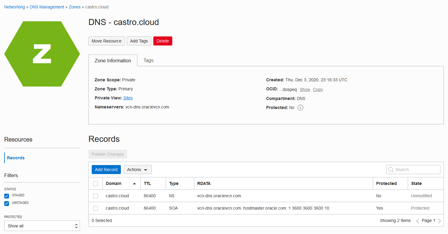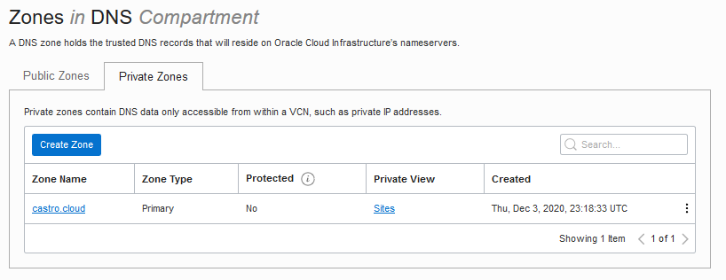 In this post, I show you how to configure a split-horizon DNS zone. You can use any published DNS zone in OCI or elsewhere. In a previous blog post, I explained how to configure an internet DNS zone. Here, I use the internet DNS zone from that post, which is castro.cloud, and add the private DNS portion to complete the split-horizon configuration.