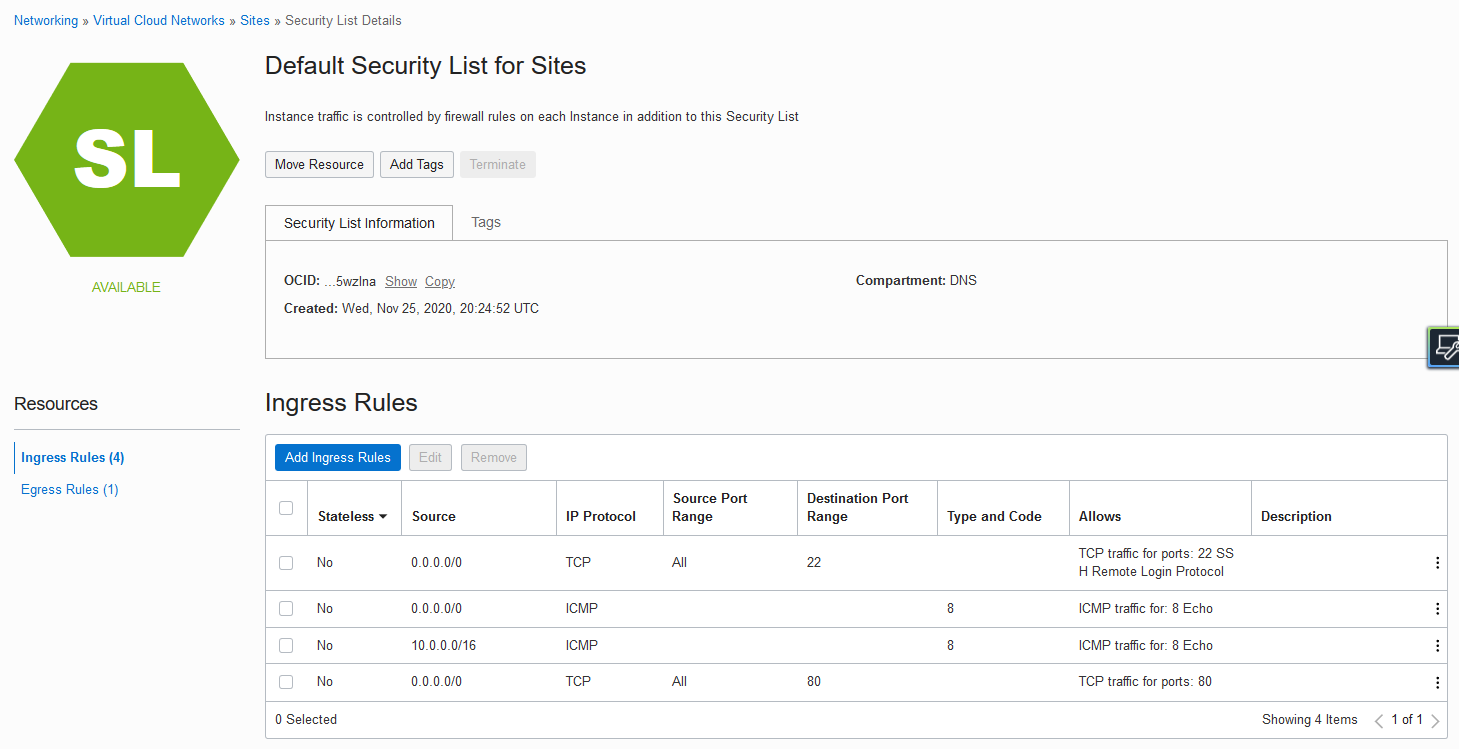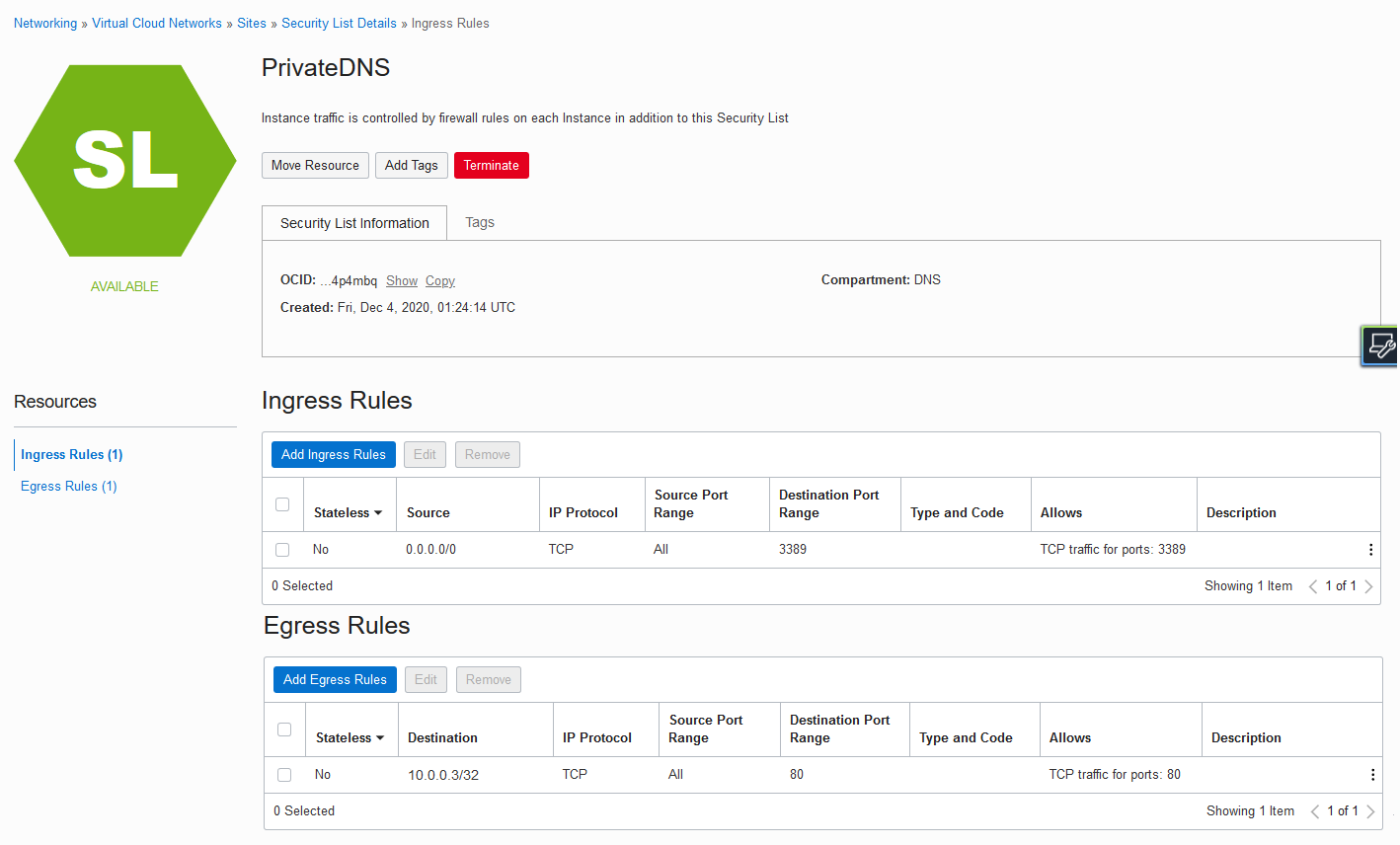 To ensure that you’re reaching the private DNS and not the internet DNS, use strict security list rules on this new subnet. The new security rule allows egress traffic only to 10.0.0.3 on port 80.