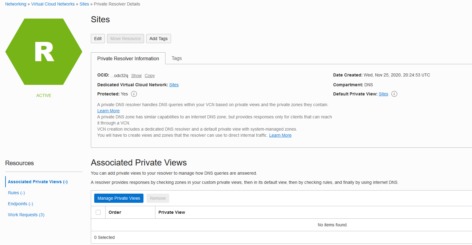 “A private DNS resolver handles DNS queries within your VCN based on private views and the private zones they contain. A private DNS zone has similar capabilities to an Internet DNS zone, but provides responses only for clients that can reach it through a VCN.”