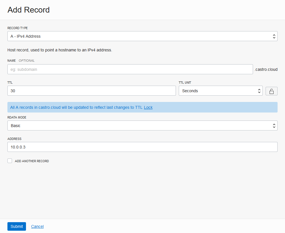 Next, click Add Record and create an A record that maps castro.cloud to the webserver’s private IP address, which is 10.0.0.3.