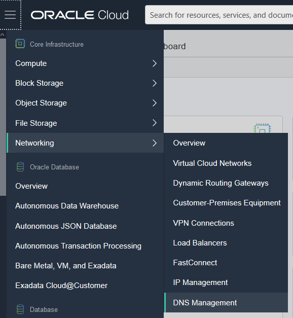 You can access internet and private DNS zones in the OCI Console by navigating to Networking and then DNS Management in the main menu.