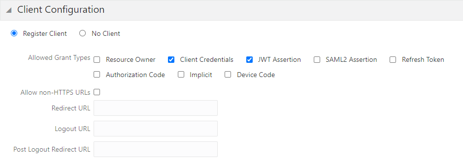 For our use case, we will set the grant types to Client Credentials and JWT Assertion only as in the following image.