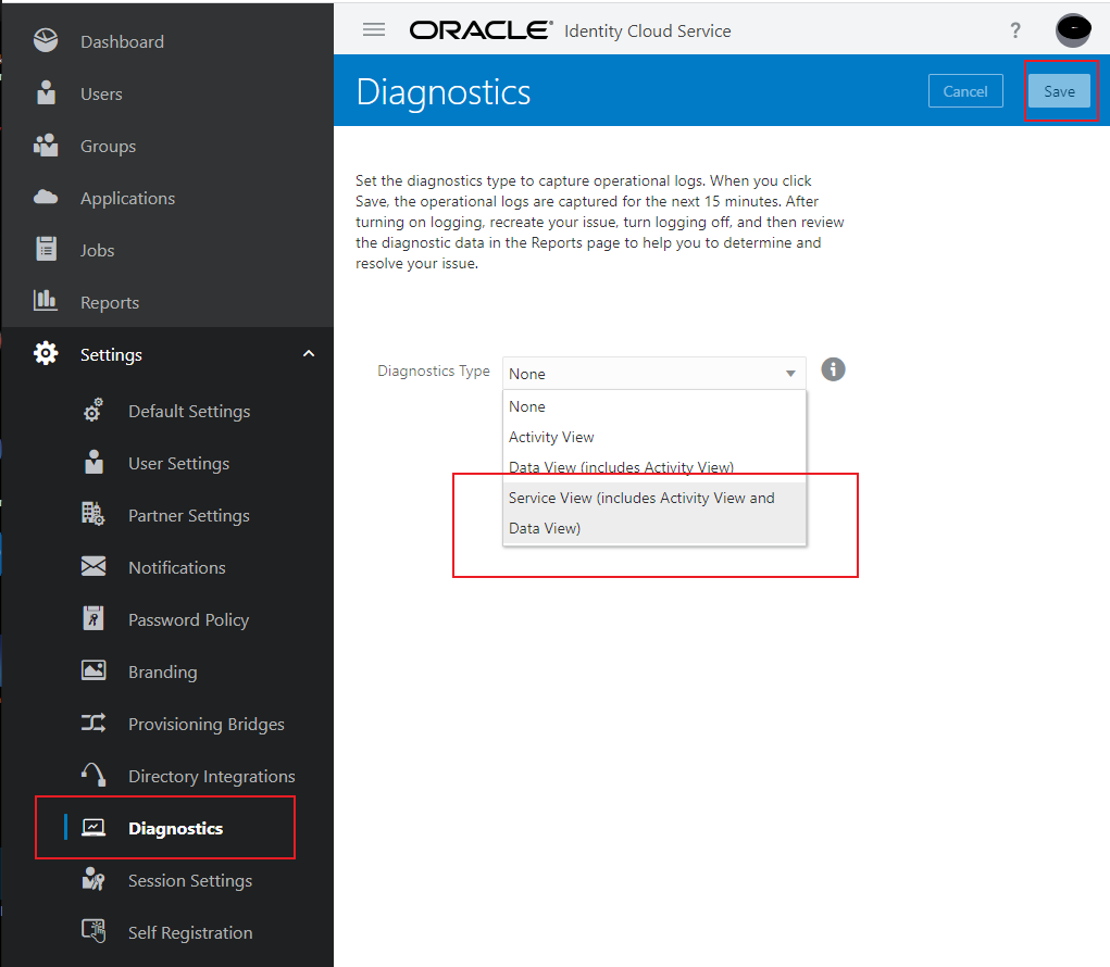 In case you run into errors, you can get some information from IDCS by turning on Diagnostics as shown in the image below: