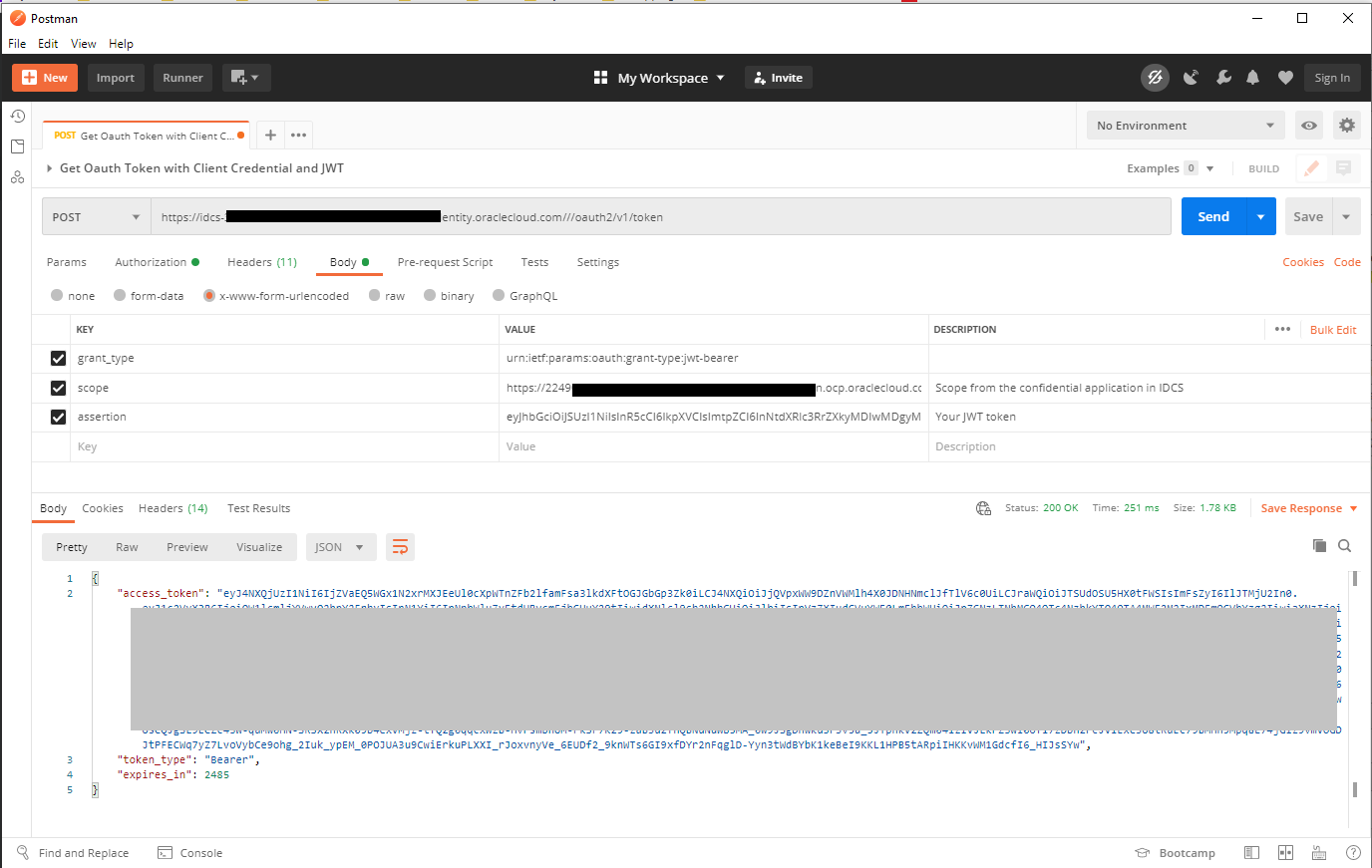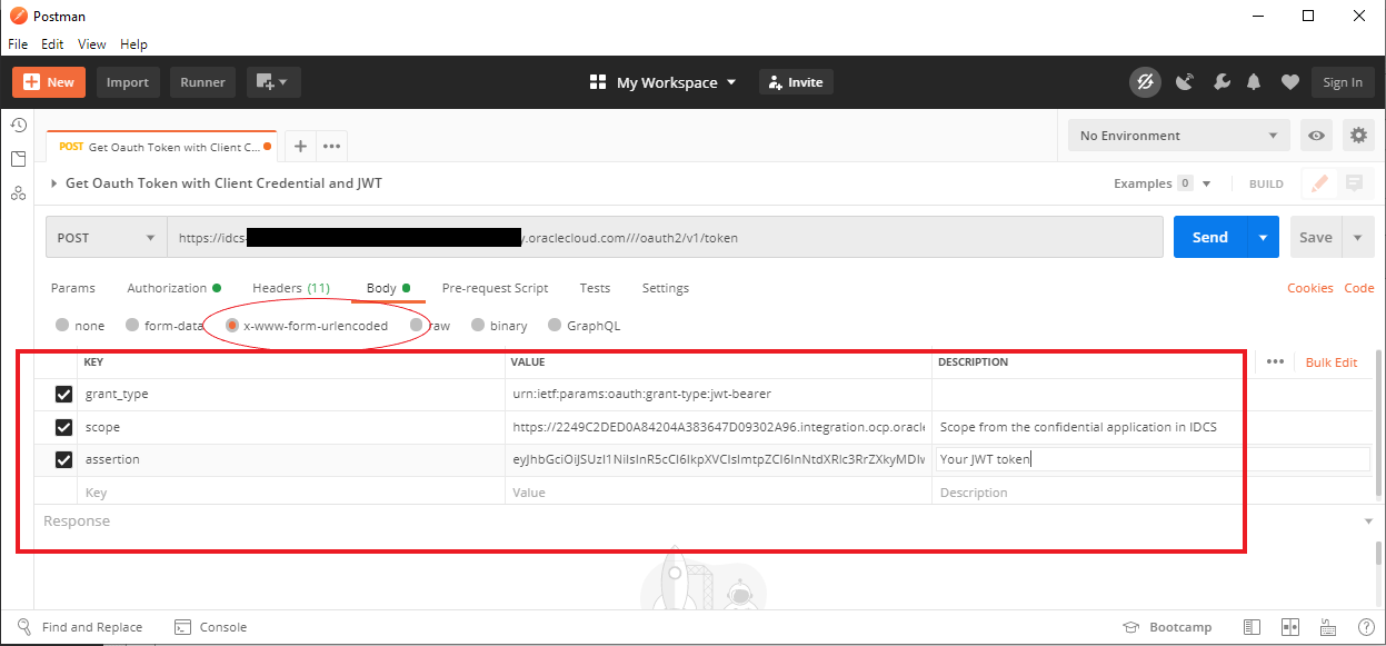 Follow the images below to set up Postman to use the JWT token to retrieve an access code from IDCS: