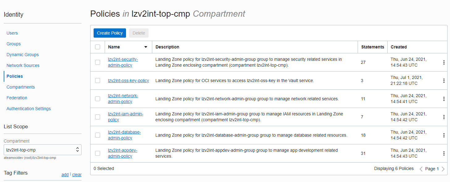 Look at the policies created in the enclosing compartment (lzv2int-top-cmp):