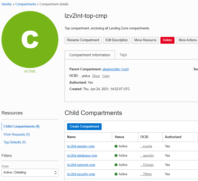 Once the Stack is applied, observe the compartment structure in the picture below. Four child compartments, namely lzv2int-appdev-cmp, lzv2int-database-cmp, lzv2int-network-cmp, lzv2int-security-cmp , are created under lzv2int-top-cmp, our Existing enclosing compartment selected above. It happens to exist under the tenancy Root compartment, as we can see in Parent Compartment.