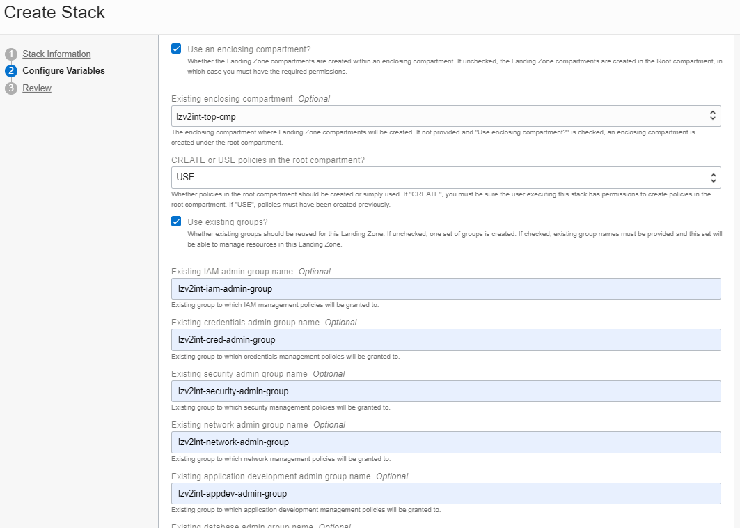 - use_enclosing_compartment: Whether the Landing Zone compartments are created within an enclosing compartment. If false, the Landing Zone compartments are created under the Root compartment.
