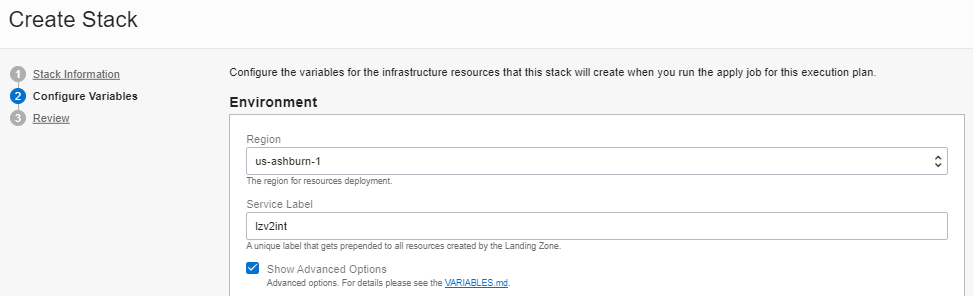 In the Configure Variables screen, pick a Region and enter a Service Label in the Environment area. The Service Label is a random string of your choice. The Landing Zone uses it as a prefix to all resource names. Make sure to check the Show Advanced Options for setting the environment options.