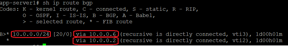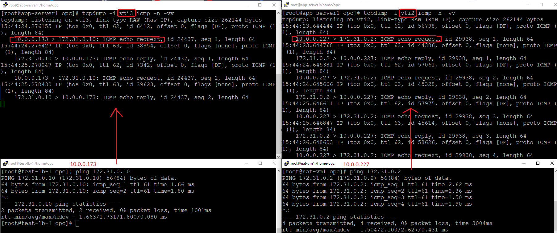 As we can see, the traffic from 10.0.0.173 to 172.31.0.10 is using vti3 (Tunnel2) and the traffic from 10.0.0.227 to 172.31.0.2 is using vti2 (Tunnel1). You can check the vti to Tunnel mapping in the Networking Diagram from point 1.