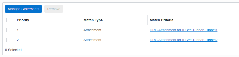 2.3 On the DRGv2 create a Route Import, attach the Route Import to a new created Route Table, attach the Route Table to both IPSec tunnel attachments