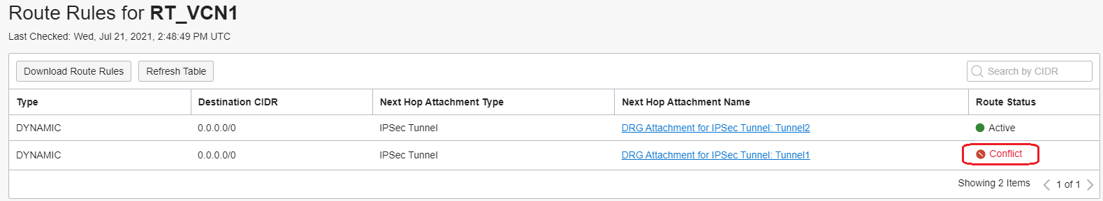 As we can see, both default routes have been imported but one is marked as Conflict. This means the DRGv2 will not use at all for forwarding the traffic. Why did this happen?