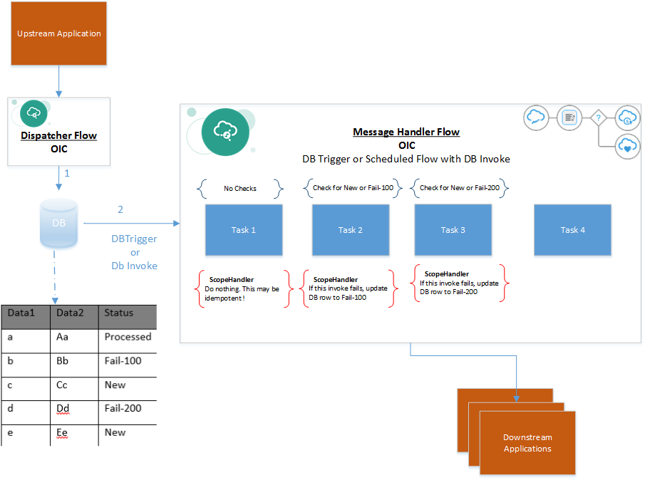 A Message Handler integration periodically polls the stage table and retrieves unprocessed input messages. Any errors during various stages of processing are ‘caught’ in scope level. Error handlers and the milestone stage is updated in the stage table. The subsequent polls of the message handler flow will retrieve these semi processed records and process them based on the appropriate milestone markers