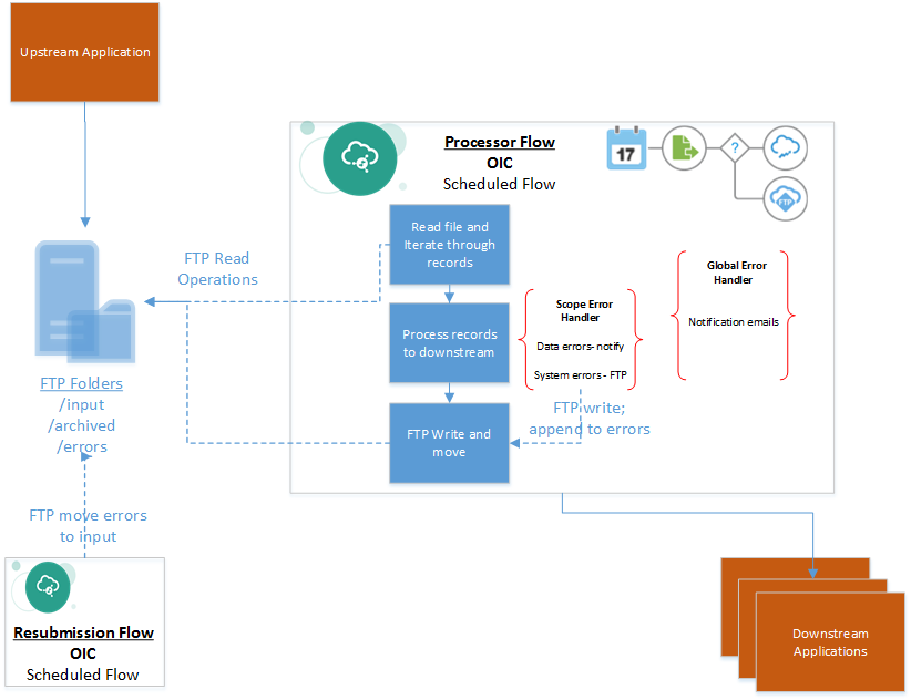 Let us look at another design suitable for file based flows. Bulk interfaces using files often use an FTP server for file storage, This pattern will implement a simple error handling leveraging the FTP server and enable re-processing of failed instances by using multiple FTP folders and move operations between folders using FTP adapter.