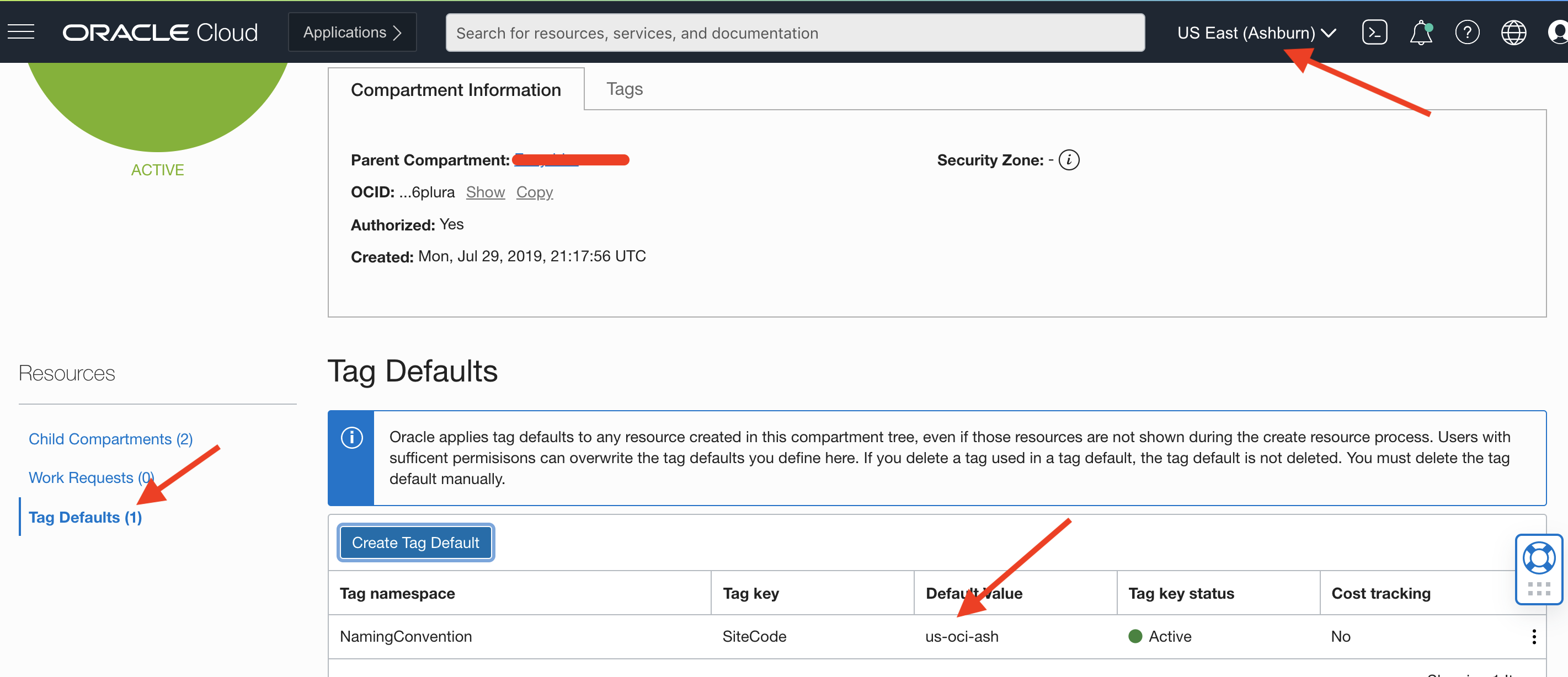Next, add the SiteCode tag to the Region compartment, selecting the appropriate region specific value for the tag. For example, for the “Region Compartment – Ashburn” compartment in Fig 1 above, select the tag value of us-oci-ash. This is shown below –