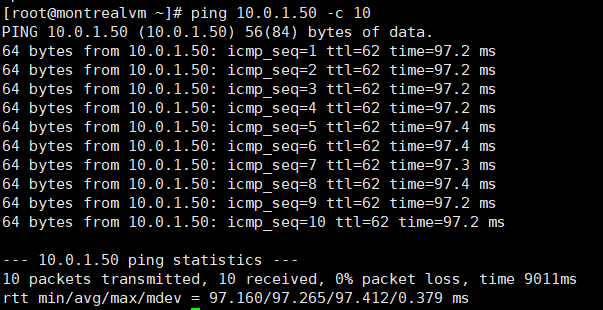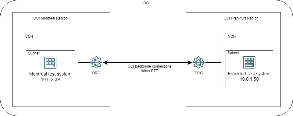 We will use 2 Compute instances in different OCI Regions and interconnected over the OCI backbone. The latency between the two regions is roughly 98ms, a value we will use in our calculations.