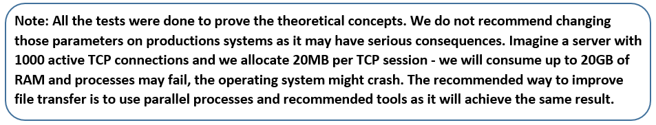 We will do one batch of tests with OS default values for TCP buffers, 1 batch of tests with increased buffers values targeting half of the available bandwidth – 500 Mbps, and 1 batch of tests targeting the “maximum” throughput of 1Gbps per single-stream