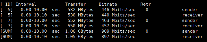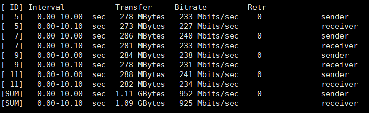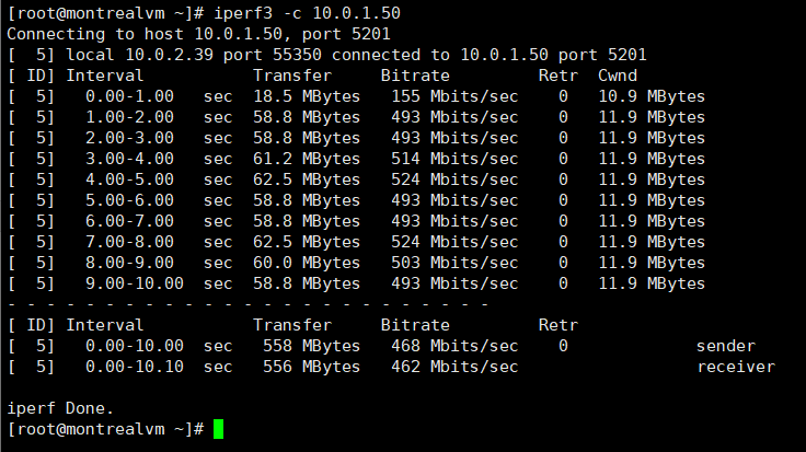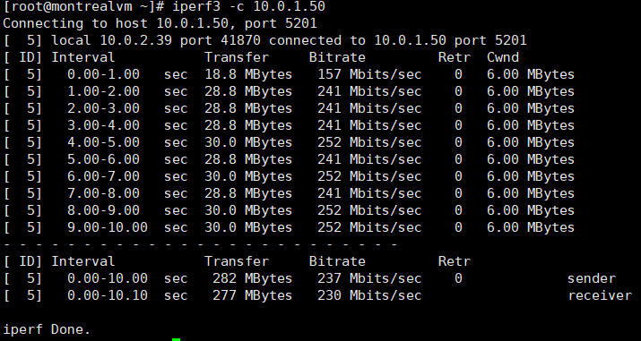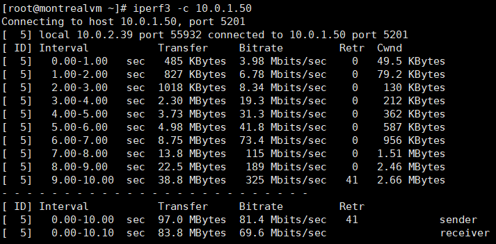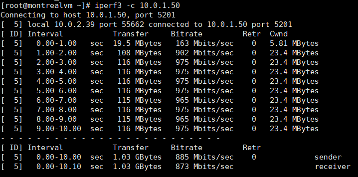 As we can see, iperf can use most of the available bandwidth for a single-stream. To fill the entire link we will use 4 parallel streams (iperf3 -c 10.0.1.50 -P 4).