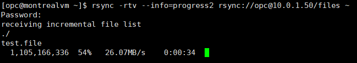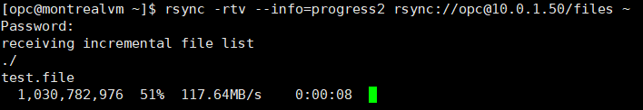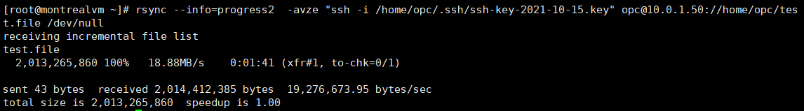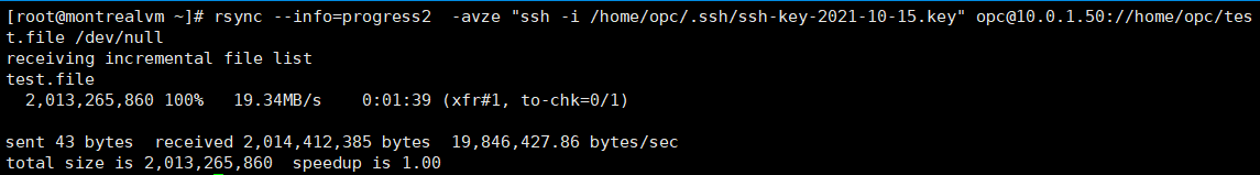 Rsync had a top speed of 20.46 MB/s (164 Mbps) and an average speed of 20.13 MB/s.