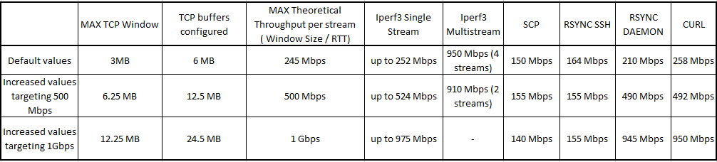 I’ve gathered all the results in a table so we can see the impact of modifying TCP buffers. All the values below are for MTU – 9000 bytes: