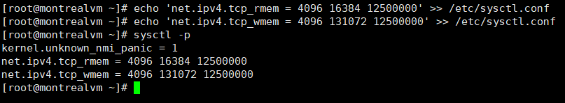 To modify the default values we need to put the new ones in “/etc/sysctl.conf” and input “sysctl –p” so the kernel loads the new parameters. We need to do this on both endpoints. I will put 12500000 to account for the rough calculations.