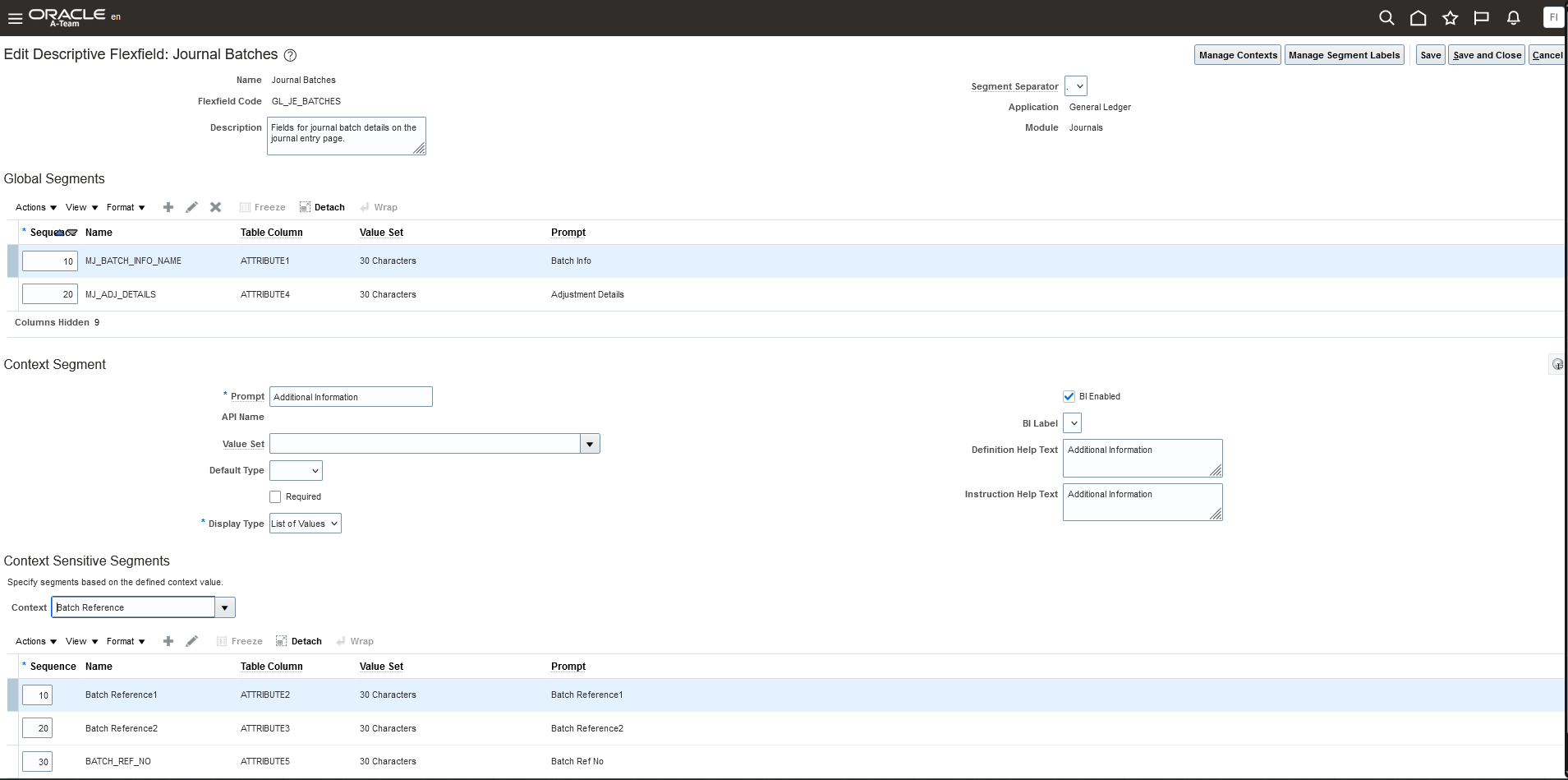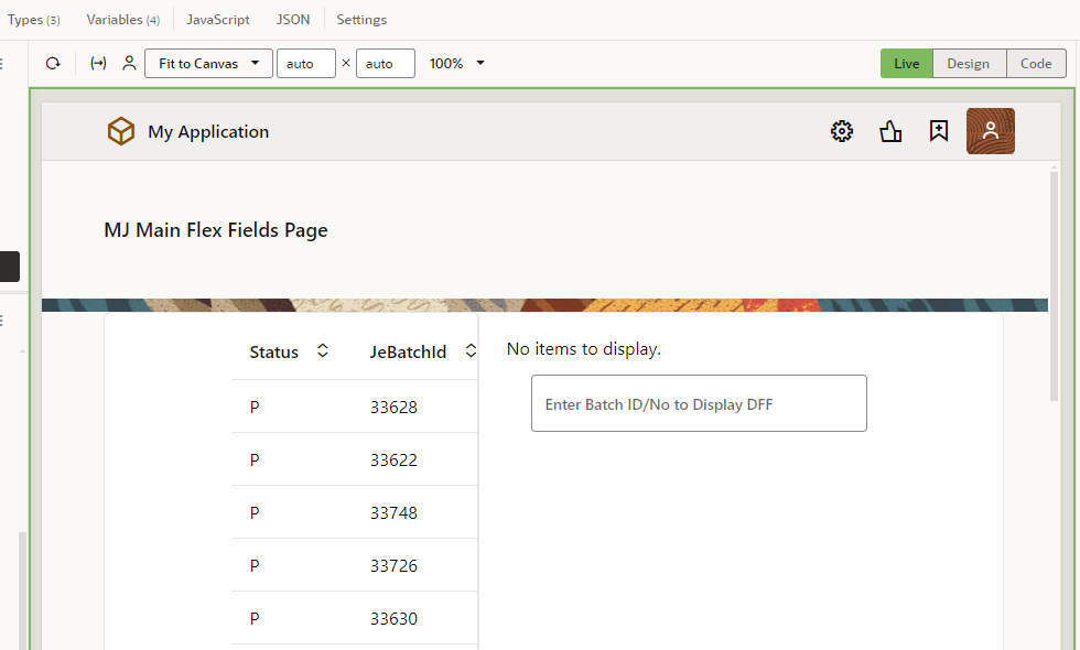 GL_FLEX_BATCH_ID : Scenario1 : This variable has the value from batch id from panel1 (Event: TableFirstSelectedRow) and pass the value to the DFF Rest API and get the journal DFF data and displayed in the panel 2. So, whenever user selects the journal data in the first panel , corresponding DFF data would be displayed in the panel2.