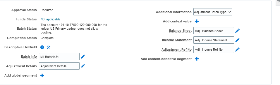 User enters the Batch ID data in the panel 2 text field and displays the corresponding journal DFF data in the panel2.