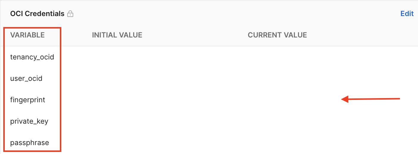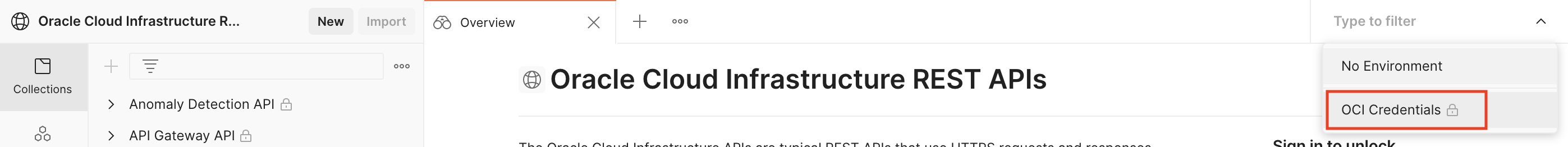 To call any REST APIs, user will need to supply OCI credentials (5 authentication pieces explained below). The workspace also has environment setup with required OCI credentials. The “OCI Credentials” environment needs to be selected for REST APIs calls.