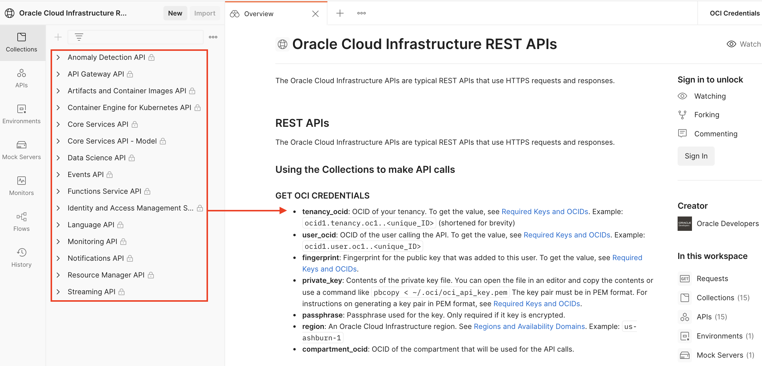 Oracle Cloud Infrastructure REST APIs workspace: It has various collections of OCI Rest APIs.