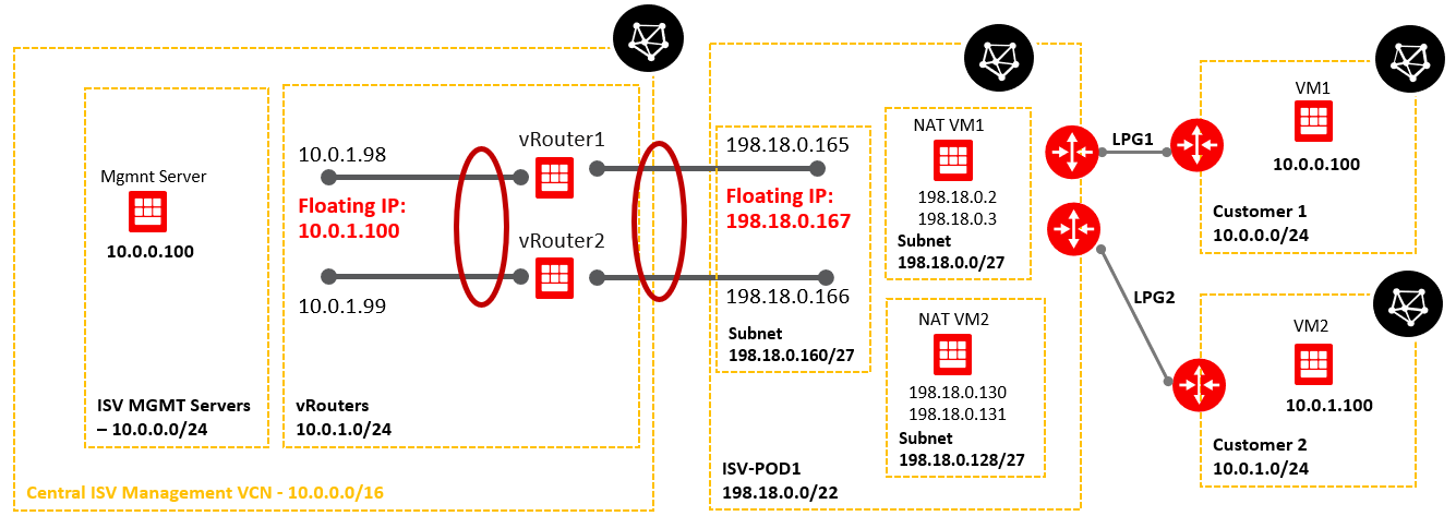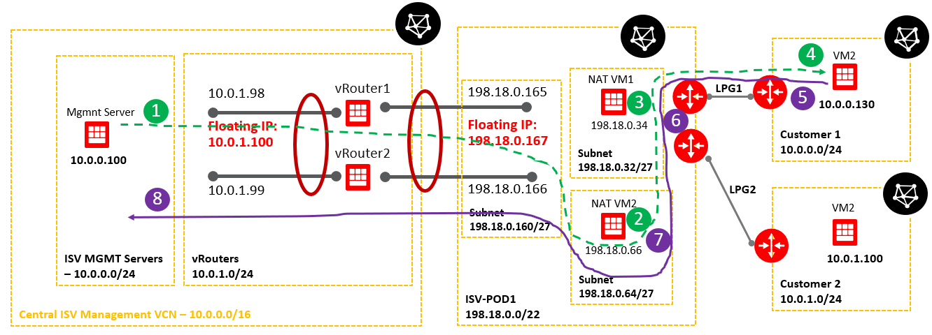 As we can see from the routing tables configured above, NAT VM1 has connectivity to the customer VCNs via respective LPGs and NAT VM2 IP connectivity to the ISV Mgmt Servers using the vRouter floating IP as a next-hop. This is the reason we need two NAT VMs, with just only one we cannot handle the routing in a correct manner -> using just one VM it will be exposed to the same destination network 10.0.0.0/16 with two different next hops. This is not allowed in OCI. Even we create a second vnic in another subnet we will face issues with the routing at the VM level.