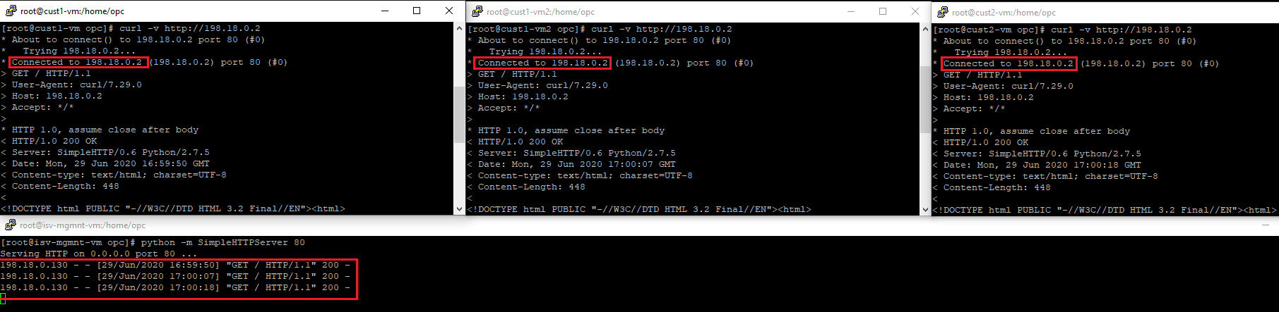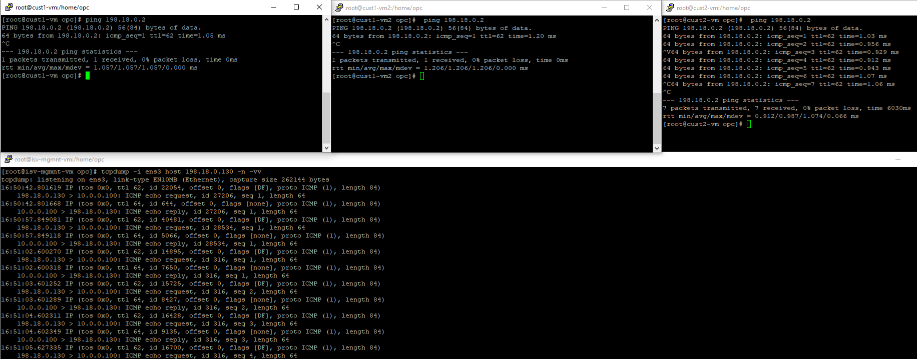 In order for the traffic from Customer 2 VM2 (formerly VM2) to work, we need to send it to an IP destination address different than 10.0.0.100 (assigned to the Mgmt Server) to avoid any routing issues in the ISV Mgmt VCN tacking into account that Customer 2 VCN overlaps with 10.0.0.0/16 assigned to the ISV Mgmt VCN. The destination IP address used will be 198.18.0.2, the same as in Case 1.