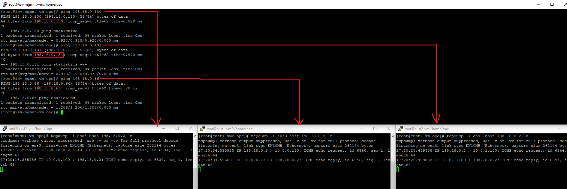 5.1 ICMP from Customer 1 VM1 and VM2 + Customer 2 VM2 toward ISV Mgmt Server