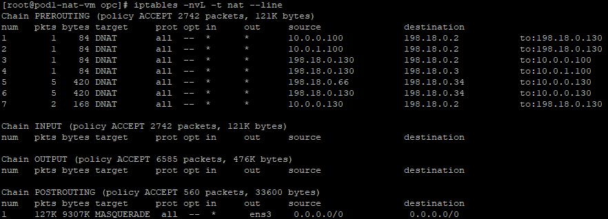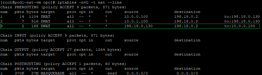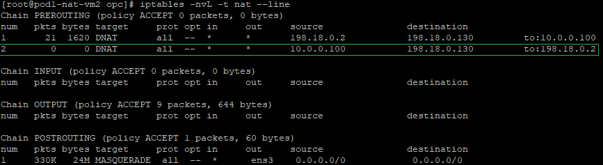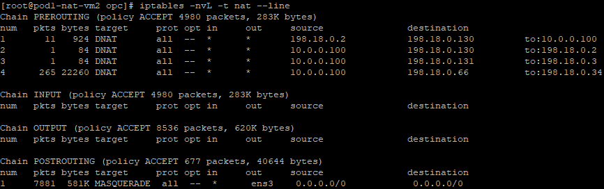 a) create a DNAT entry and change the destination IP address from 198.18.0.130 to 10.0.0.100 which is the Mgmt Server in the Magmnt ISV VCN. We can see this NAT VM2 is exposed only to the Mgmt VCN CIDR range. The command: