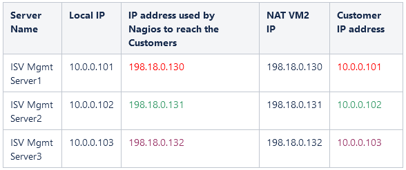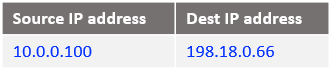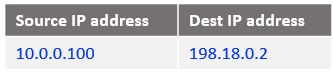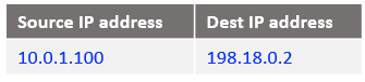 In order for the source IP address of Mgmt Server (10.0.0.100) to not appear in the IP packet arriving at the NAT VM1, we will NAT all source IP addresses from the Mgmt ISV side at the NAT VM2 using its primary IP address, which is 198.18.0.130. This is done by using the NAT Masquerade statement defined above.