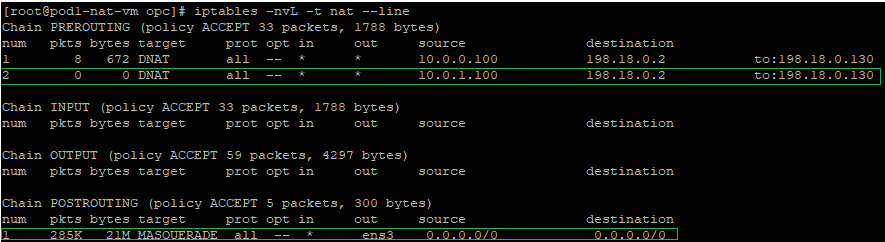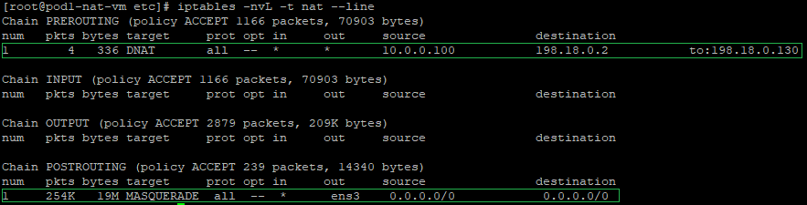 The final verification will imply to check the NAT tables and see if the configuration has been inserted, the command to use: iptables -nvL -t nat --line